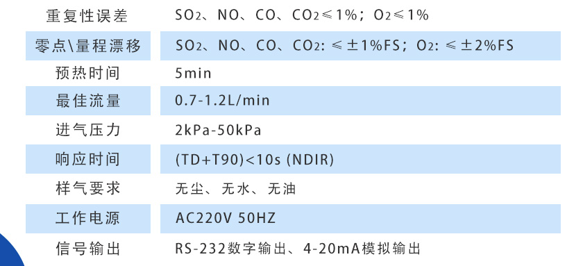 SO2、NO、CO、CO2:≤±1%FS;O2:≤±2%FS |