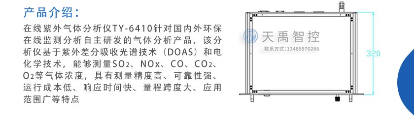 • 在線紫外氣體分析儀 TY-6400 針對國內外環保在線監測、工業在線分析自主研發的氣體分析產品。該分析儀基于紫外差分吸收光譜技術(DOAS)和化學計量學算法(PLS),能夠測量SO2、NO、NO2、O2、NH3、CO、CO2、Cl2、O3、H2S、HCl、CH3I等氣體濃度,具有測量精度高、可靠性強、運行成本低、響應時間快、量程跨度大、應用范圍廣等特點。