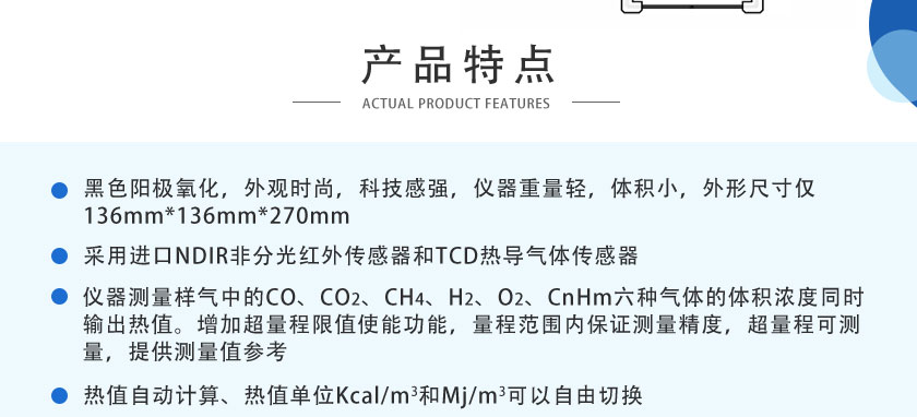 CO、CO2、CH4、CnHm :NDIR非分光紅外;H2:TCD熱導, O2:ECD電化學