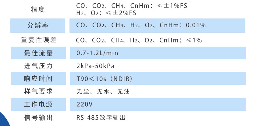 CO、CO2、CH4、CnHm:≤±1%FS;H2、O2:≤±2%FS