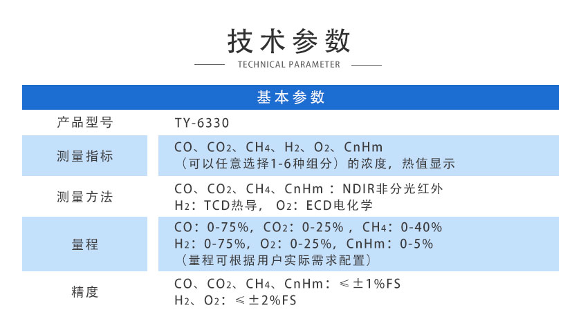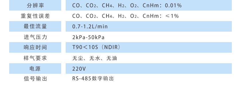 CO、CO2、CH4、CnHm :NDIR非分光紅外 H2:TCD熱導(dǎo), O2:ECD電化學(xué) |