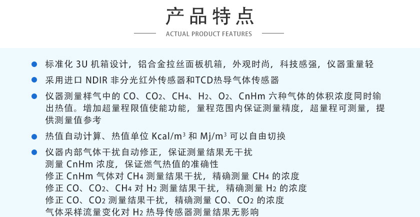 采用自主知識產(chǎn)權(quán)的NDIR非分光紅外技術(shù),主要用于測量氣體中的CO、CO2、CH4、C3H8、SO2、NO等氣體的體積濃度及熱值。全進(jìn)口傳感器、測量精度高、結(jié)構(gòu)簡單、維護(hù)方便,軟件功能強(qiáng)大,可拓展性強(qiáng)、現(xiàn)場實用性好,目前暢銷國內(nèi)外。