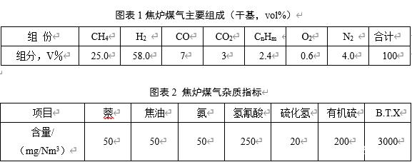 焦?fàn)t氣是混合物,其產(chǎn)率和組成因煉焦用煤質(zhì)量和焦化過程條件不同而有所差別,一般每噸干煤可生產(chǎn)焦?fàn)t氣300~350m3(標(biāo)準(zhǔn)狀態(tài))。其主要成分為氫氣(55%~60%)和甲烷(23%~27%),另外還含有少量的一氧化碳(5%~8%)、C2以上不飽和烴(2%~4%)、二氧化碳(1.5%~3%)、氧氣(0.3%~0.8%))、氮?dú)?3%~7%)。