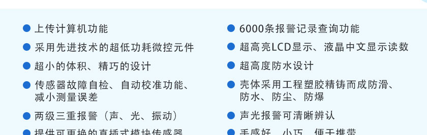 采用進口催化燃燒傳感器和微控制器技術,帶2.5寸高清彩屏實時顯示,帶聲光+視覺報警,現場多種氣體濃度 24 小時連續在線監測及溫濕度的測量,適用于各種環境中的可燃氣體濃度檢測,響應速度快,測量精度高,穩定性和重復性好,整機性能居國內領先水平。儀器具有多種超強的電路保護功能,可防止錯接電源、反接電源、電源短路、電源不穩、電源與信號錯解等,導致的儀器損壞。