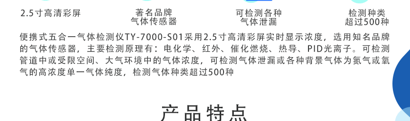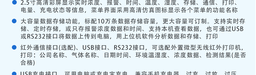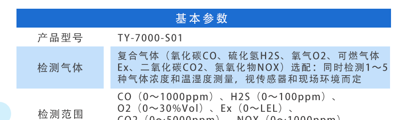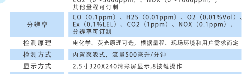 CO(0.1ppm)、H2S(0.01ppm)、O2(0.01%Vol)、Ex(0.1%LEL)、CO2(1ppm)、NOX(0.1ppm),分辨率可訂制 |