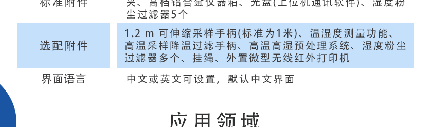 1.2 m 可伸縮采樣手柄(標準為1米)、溫濕度測量功能、高溫采樣降溫過濾手柄、高溫高濕預處理系統、濕度粉塵過濾器多個、掛繩、外置微型無線紅外打印機 |