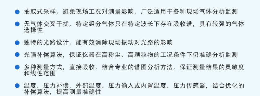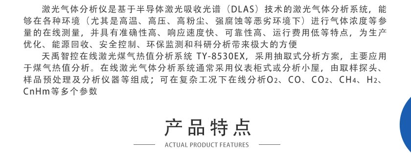 激光氣體分析儀基于半導體激光吸收光譜(DLAS)技術,能夠在各種環境(尤其是高溫、高壓、高粉塵、強腐蝕等惡劣環境下)進行氣體濃度等參量的在線測量,并具有準確性高、響應速度快、可靠性高、運行費用低等特點,為生產優化、能源回收、安全控制、環保監測和科研分析帶來極大的方便,在鋼鐵冶金、石油化工、環境保護和能源電力等行業已得到廣泛的應用。 天禹智控在線激光煤氣熱值分析系統TY-8530EX,采用抽取式分析方案,主要應用于煤氣熱值分析。在線激光氣體分析系統通常采用儀表柜式或分析小屋,由取樣探頭、樣品預處理及分析儀器等組成;可在復雜工況下在線分析O?、CO、CO?、CH?、H?、CnHm等多個參數,針對