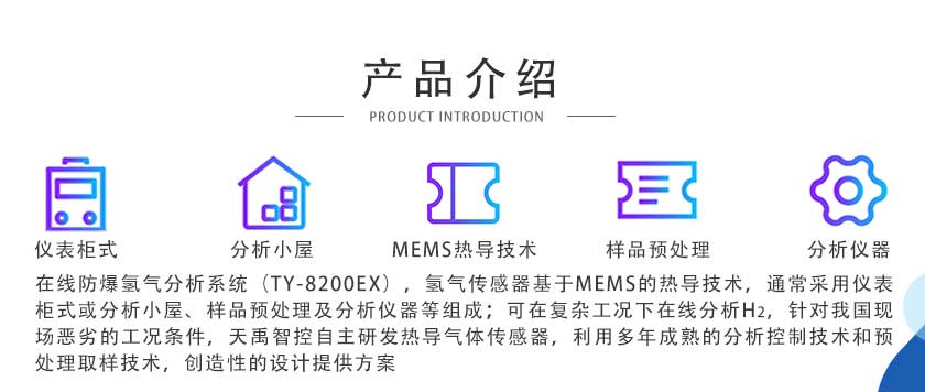 在線防爆氫氣分析系統(TY-8200EX),氫氣傳感器基于MEMS的熱導技術,通常采用儀表柜式或分析小屋、樣品預處理及分析儀器等組成;可在復雜工況下在線分析H2,針對我國現場惡劣的工況條件,天禹智控自主研發熱導氣體傳感器,利用多年成熟的分析控制技術和預處理取樣技術,創造性的設計提供方案。
