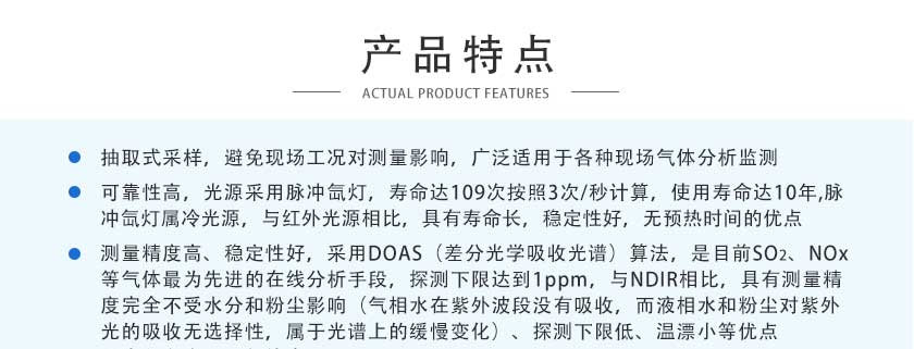 (3)測量精度高、穩定性好,采用DOAS(差分光學吸收光譜)算法,是目前SO2、NOx等氣體最為先進的在線分析手段,探測下限達到1ppm,與NDIR相比,具有測量精度完全不受水分和粉塵影響(氣相水在紫外波段沒有吸收,而液相水和粉塵對紫外光的吸收無選擇性,屬于光譜上的緩慢變化)、探測下限低、溫漂小等優點