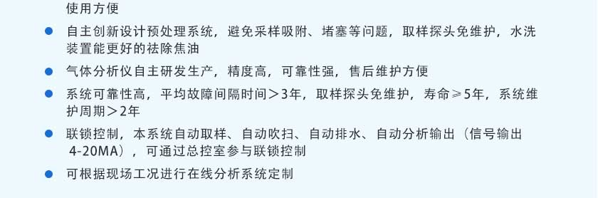 (8)自主創新設計預處理系統,避免采樣吸附、堵塞等問題,取樣探頭免維護,水洗裝置能更好的祛除焦油