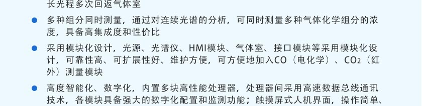 (5)多種組分同時測量,通過對連續光譜的分析,可同時測量多種氣體化學組分的濃度,具備高集成度和性價比