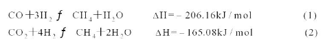 由于焦爐煤氣中CO荷CO2的總含量約為10%(v/v),多碳烴的含量為2~3%,以及約55%(v/v)的H2,所以可以利用甲烷化反應生成甲烷,主反應見反應式(1)和(2):