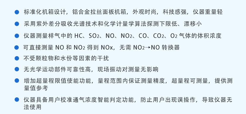 SO2、NO、NO2紫外DOAS技術;O2電化學技術;HC、CO、CO2NDIR非分光紅外技術