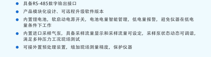 (17)內置進口采樣氣泵,具備采樣流量顯示和采樣流量可設定,采樣泵狀態動態可調諧,滿足多種壓力工況現場測試。